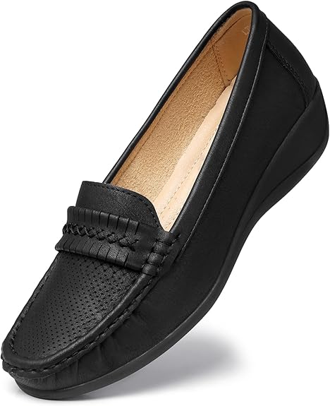 Womens Loafers Slip On Penny: Black Comfortable Leather Mid Wedge Heel Casual Flats Arch Support Round Toe Boat Shoes