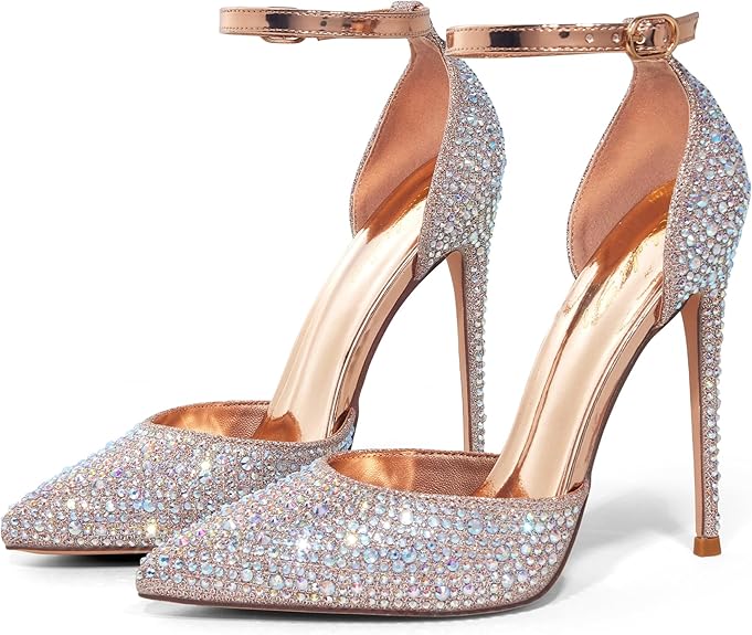 High Heels, Women Pumps D'Orsay Ankle Strap Pointed Toe Stiletto Heels Rhinestone Party Wedding Shoes